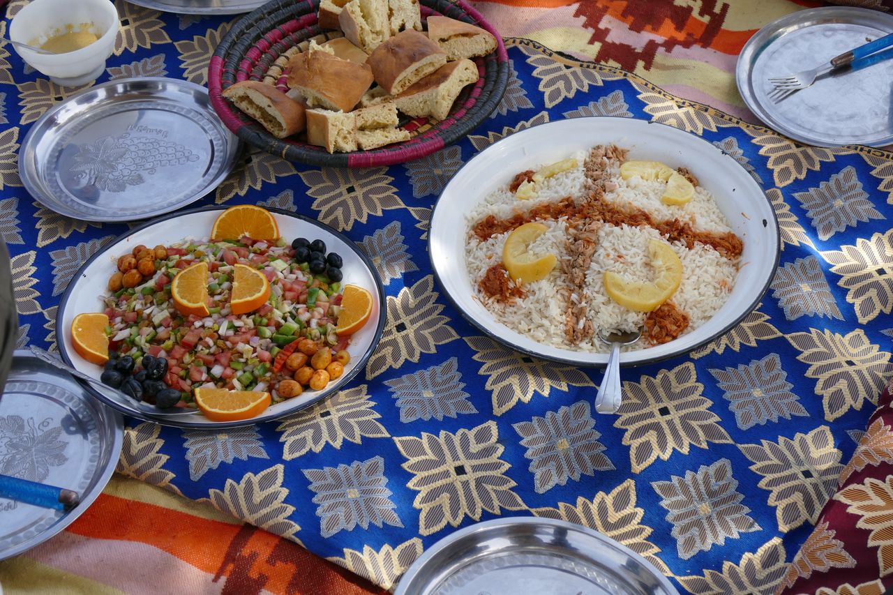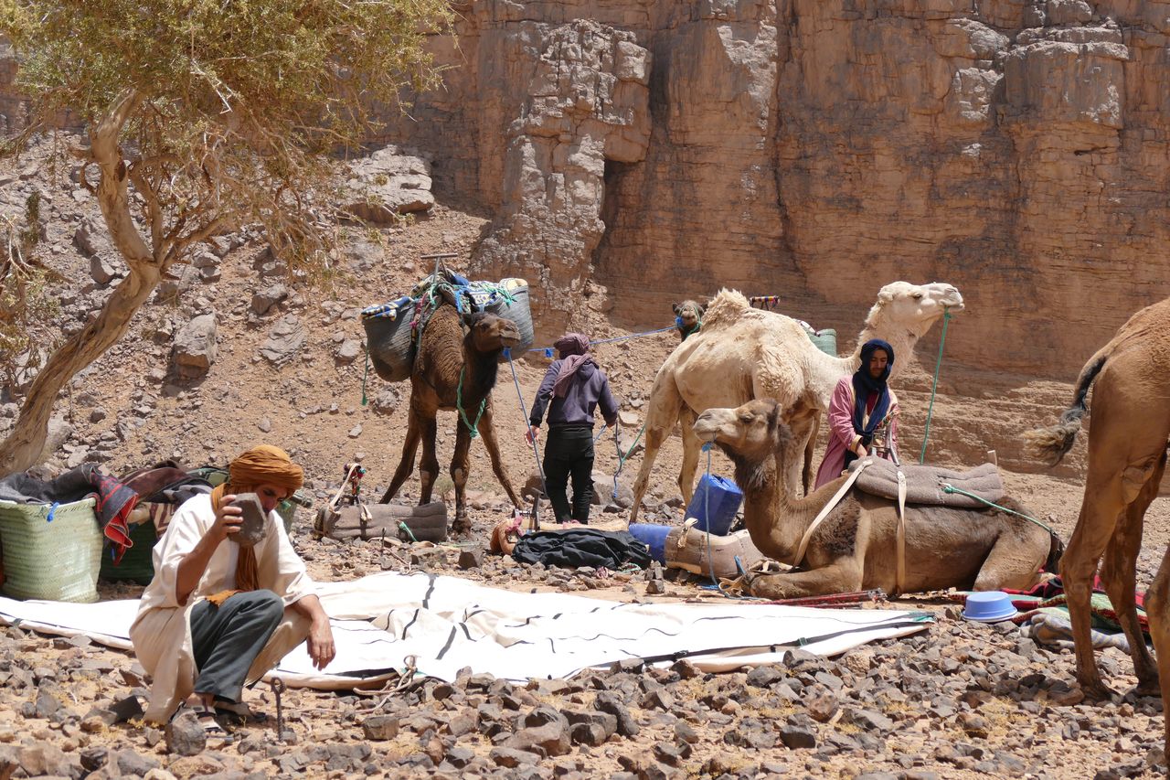 Unsere tägliche Wanderung, im gemächlichen Tempo zusammen mit den Chameliers und den Dromedaren, startet im Allgemeinen zwischen 8 und 9 Uhr und dauert am Vormittag etwa 3 bis 4 Stunden. Nach einer ausgiebigen Mittagspause wandern wir weitere ein bis zwei Stunden. Die Mahlzeiten sind reichhaltig, abwechslungsreich und frisch zubereitet. Es stehen verschiedene Getränke zur Verfügung, Mineralwasser kann jederzeit nachgefüllt werden. Wenn genügend Feuerholz vorhanden ist, wird am Abend das traditionelle Fladenbrot in der Glut gebacken.